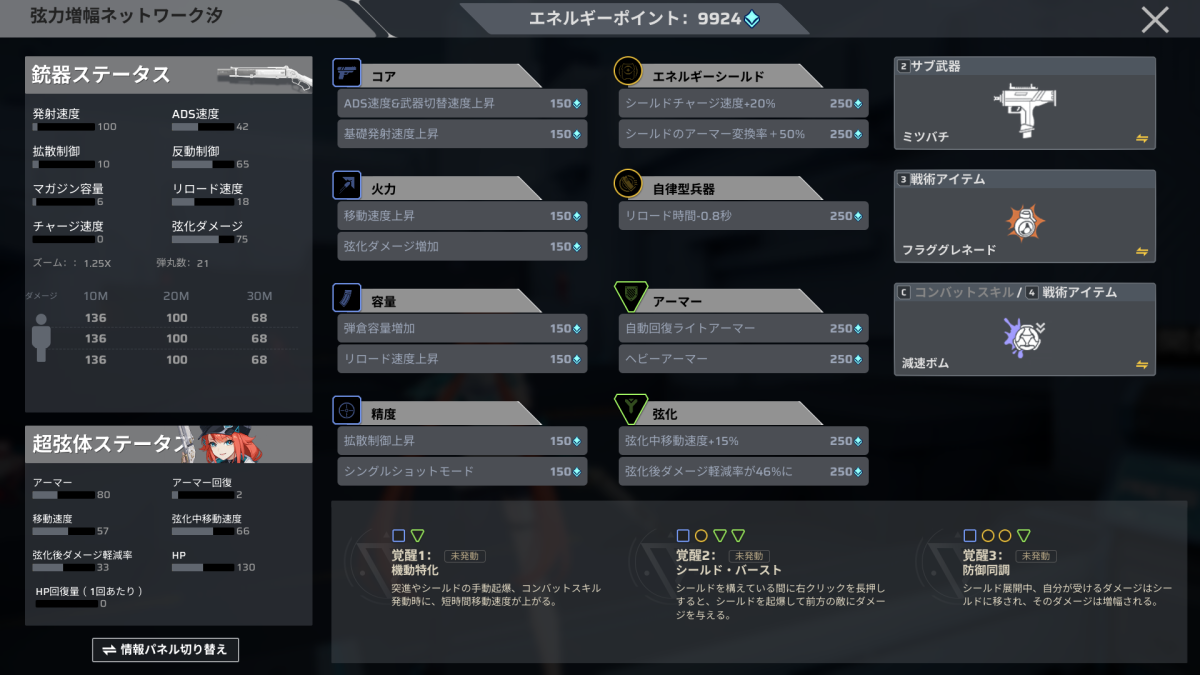 覚醒1![]() | 機動特化 突進やシールドの手動起爆、コンバットスキル発動時に、短時間移動速度が上がる |